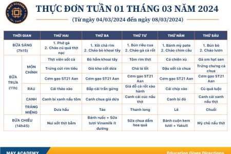 Thực đơn từ ngày 20/5/2024 đến ngày 24/5/2024